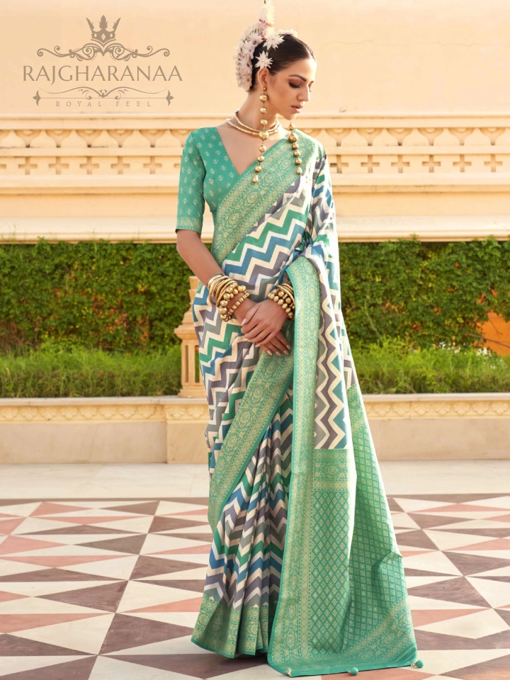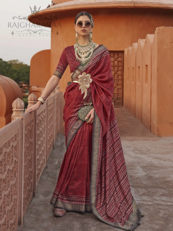 In addition to bridal lehengas, Rajgharanaa offers a wide array of designer sarees. These sarees showcase India’s rich textile heritage and are perfect for brides, wedding guests, and festive occasions. The collection includes: