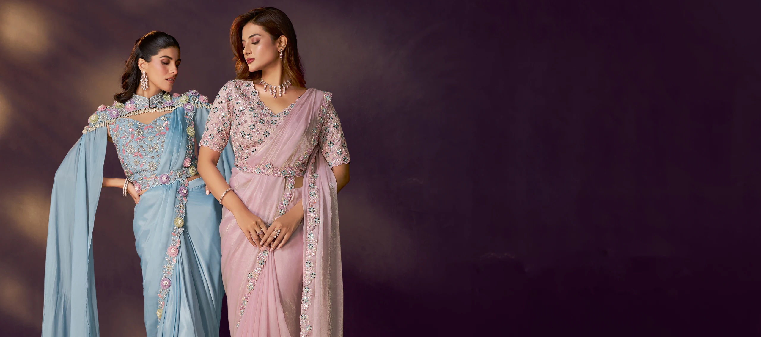 Luxury Party Wear Sarees – Contemporary designs with embroidery, stone work, or sequin embellishments.