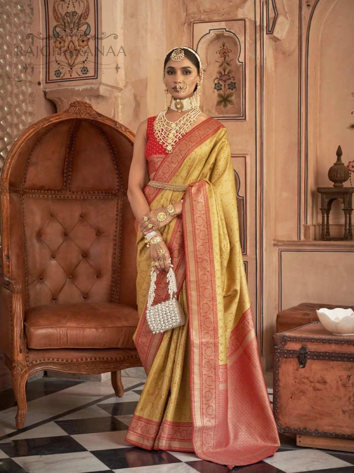 The Rajgharanaa kanjivaram silk sarees are an epitome of elegance, blending the rich, traditional silk of Kanjivaram with intricate artistry, perfect for brides seeking an opulent wedding look.