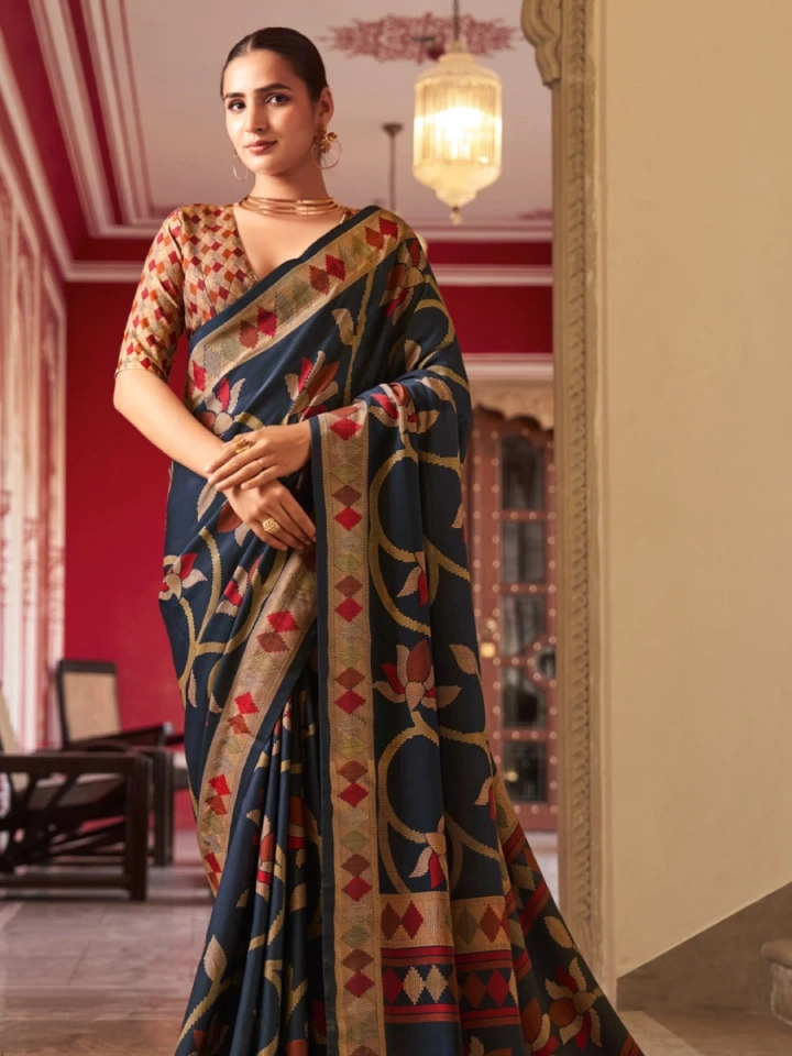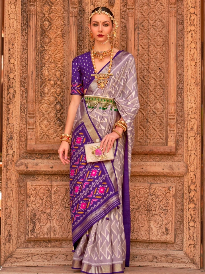 The Rajgharanaa Patola print saree blends traditional motifs with modern printed artistry, offering vibrant patterns and comfortable drape. Rajgharanaa Patola print sarees are perfect for casual wear, festive celebrations, and elegant gatherings, combining affordability with cultural charm.