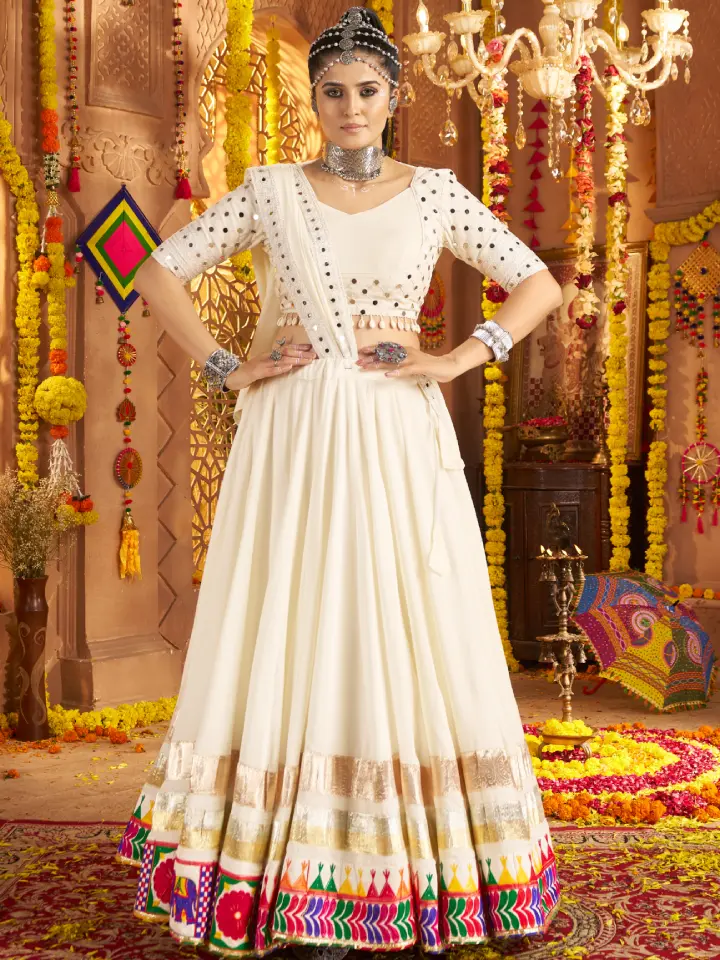 Rajgharanaa chaniya choli white exudes purity, elegance, and classic festive style. Crafted with lightweight fabrics and delicate embroidery, it ensures comfort during energetic garba dancing. Perfect for women seeking a timeless and graceful look, this outfit combines traditional artistry with modern aesthetics, making Navratri celebrations stylish and memorable.