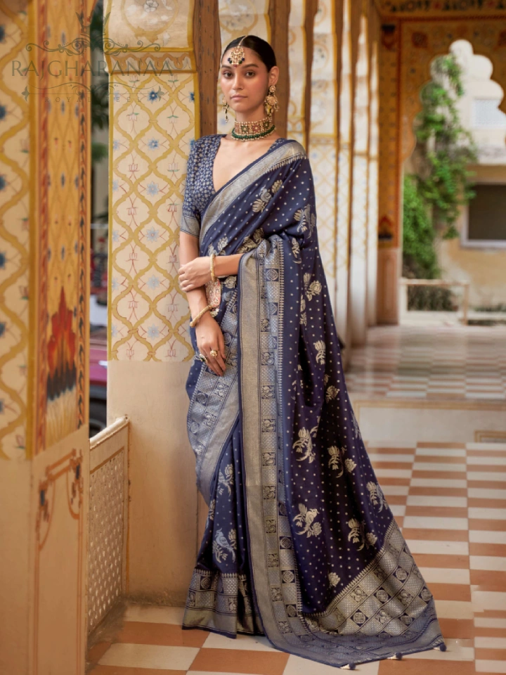 The saree’s royal appeal is perfect for wedding ceremonies.