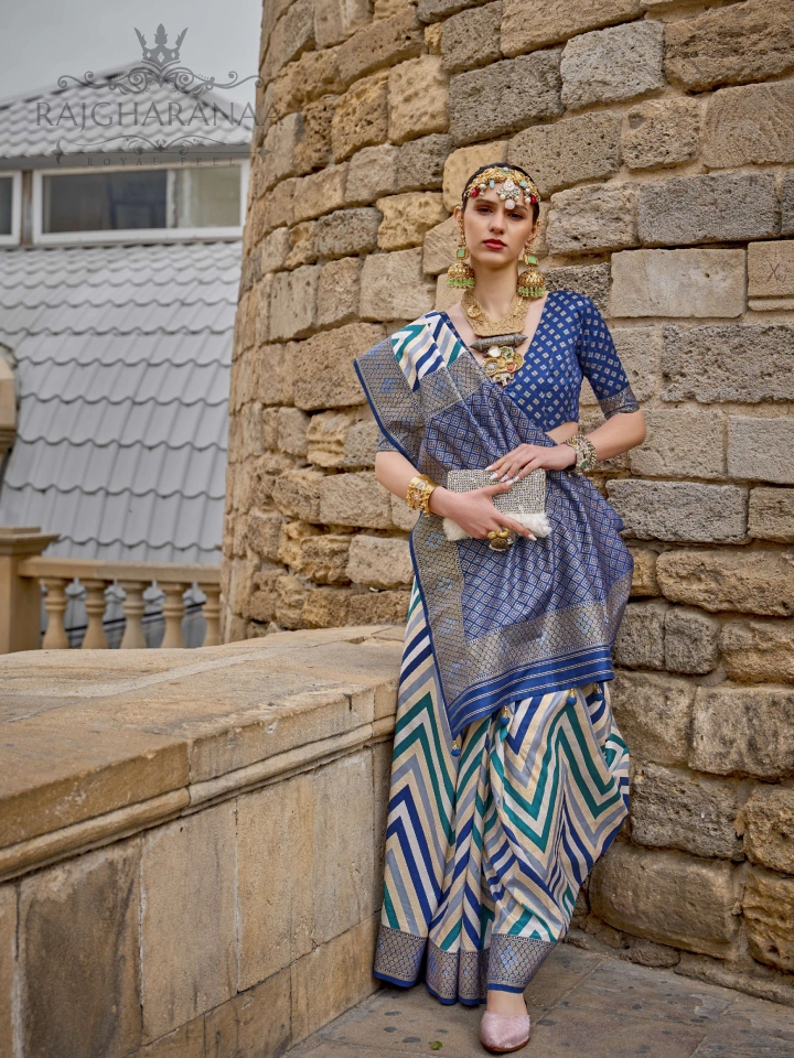 Rajgharanaa Patola Double Ikat is woven using the double Ikat technique, showcasing intricate patterns and vibrant colors. Known for its unique craftsmanship, this saree is perfect for special occasions and cultural celebrations, offering a timeless, elegant look.