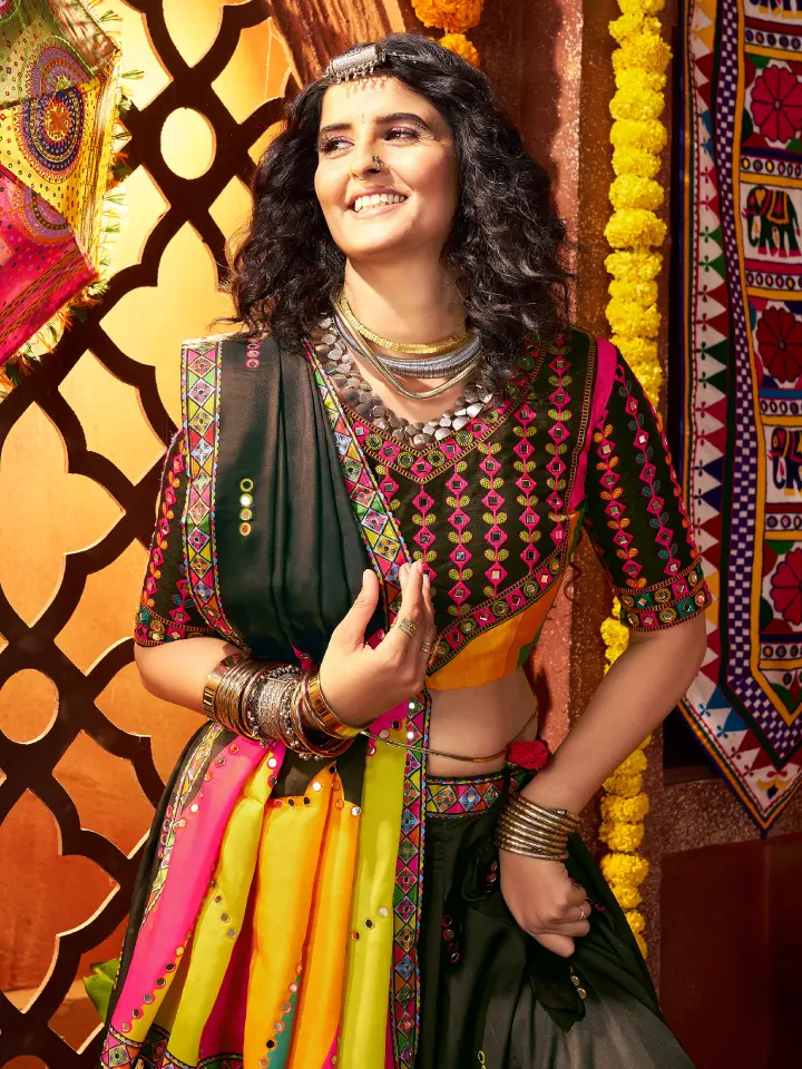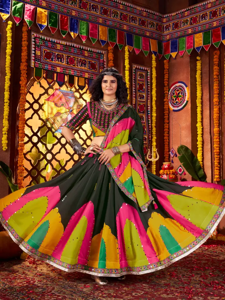 A rajgharanaa black garba dress is crafted from high-quality fabrics such as georgette, chiffon, or silk blends, ensuring comfort during long hours of garba and dandiya performances. The flowing skirt allows graceful twirls, while the fitted choli or top ensures ease of movement. Intricate embroidery, subtle mirror work, and bead embellishments create a sophisticated yet festive aesthetic, making the wearer stand out during every celebration.