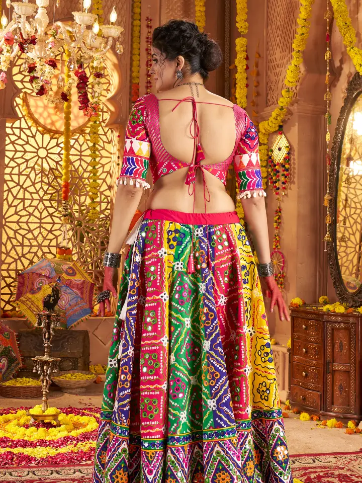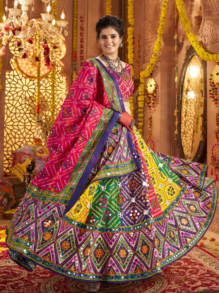 A rajgharanaa ghagra chaniya choli is crafted from lightweight fabrics such as georgette, silk, or chiffon, allowing freedom of movement for energetic dance performances. The flowing ghagra enables graceful twirls, while the fitted choli provides a comfortable and stylish fit. Embroidery, mirror work, and vibrant colors enhance its festive appeal, reflecting the joy and energy of Navratri.
