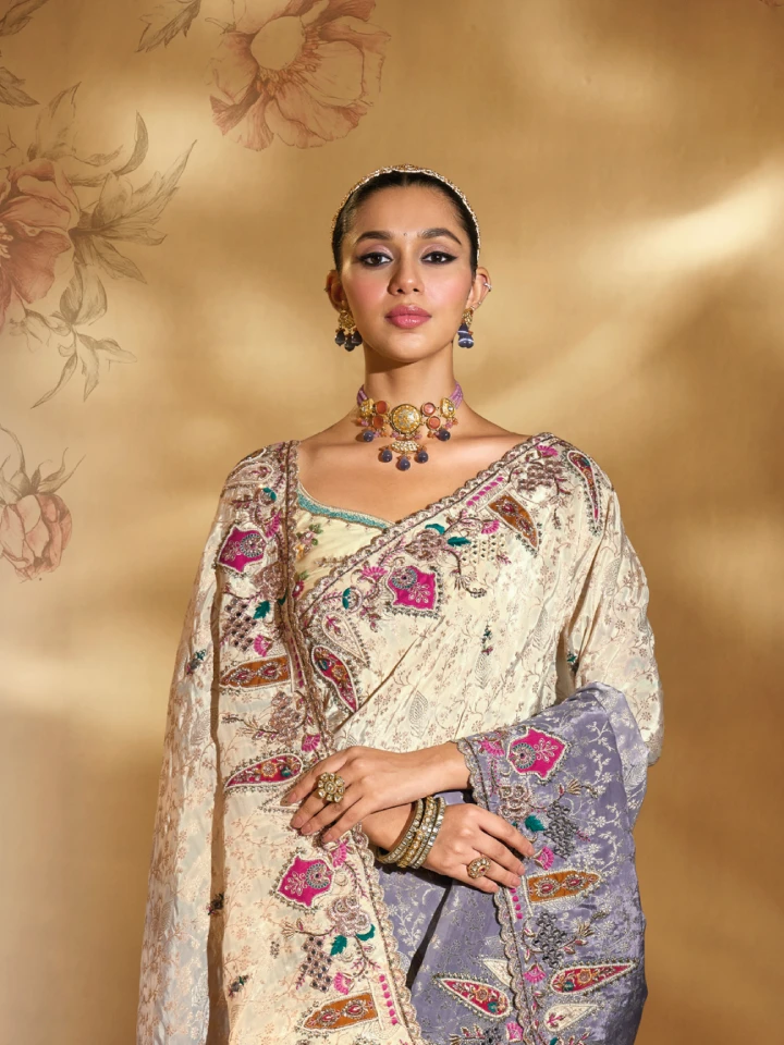 | Design & Additional | CREAM TO GREY PURE CRAPE SAREE WITH JARI.THREAD.CUT-DANA.MOTI & MIRROR HEAVY WORK |