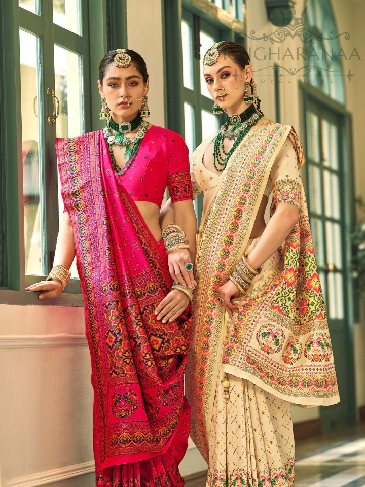 Woven from premium Banarasi silk, this saree features intricate gold and silver zari work, traditional floral motifs, paisleys, and heritage-inspired patterns that reflect centuries-old weaving traditions. The lustrous silk fabric offers a rich texture and graceful drape, enhancing the bride’s silhouette while exuding royal charm. Every Rajgharanaa Banarasi saree is a masterpiece, showcasing fine detailing and superior craftsmanship that sets it apart.